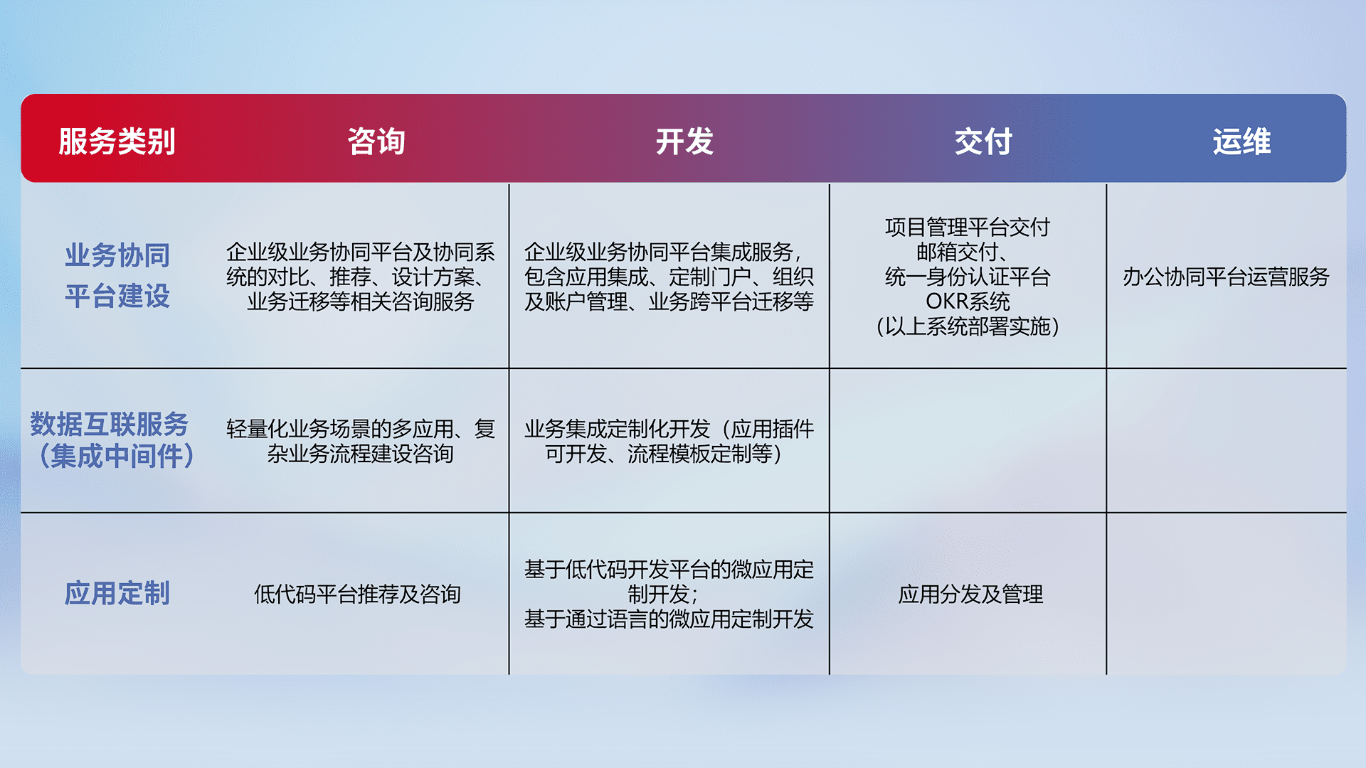 针对钉钉、、、、企微、、IDaas等平台级产品提供产品的规划、、、、方案、、、交付、、、定制化开发等服务,,实现如统一协同办公、、、智能客户服务、、、混合会议管理、、、智能数据查询、、等业务场景,,,实现数字化转型。。。